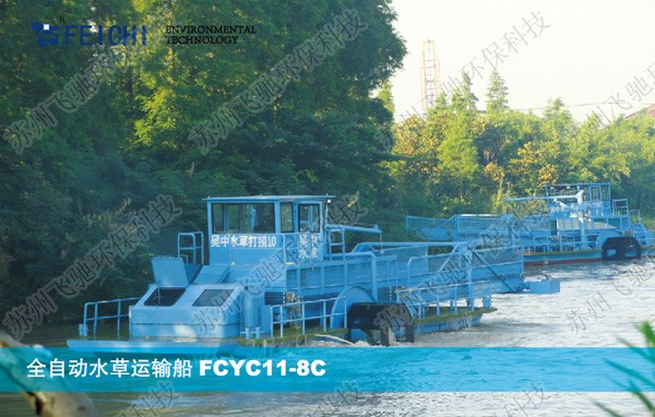 垃圾收集船又称全自动水草运输船(型号:FCYC11-8C)适用于运输水草垃圾,将打捞的水草垃圾卸载到本船输送舱。